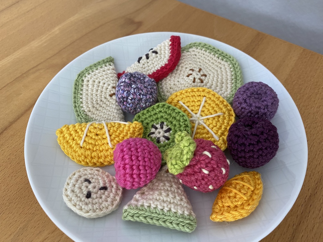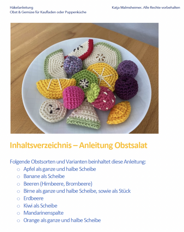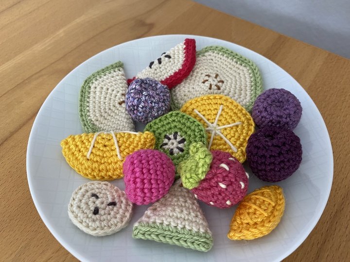 Mit dieser Anleitung kannst du einen Obstsalat mit insgesamt 8 verschiedenen Obstsorten für die Spielküche oder den Kaufladen selbst häkeln.
