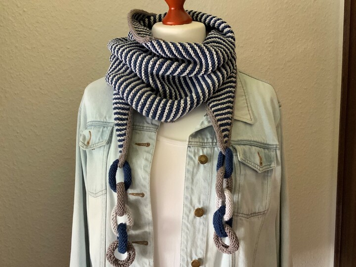 Das Tuch selber besteht nur aus rechten Maschen. Die I-Cord-Umrandung und auch die Ketten erfordern etwas Strickerfahrung. Aber auch ambitionierte Anfänger bekommen das mit etwas Geduld hin! Du solltest können: rechte Maschen, Maschen zu- und abnehmen, I-Cord-Umrandung, auf dem Nadelspiel stricken (für die Kette)