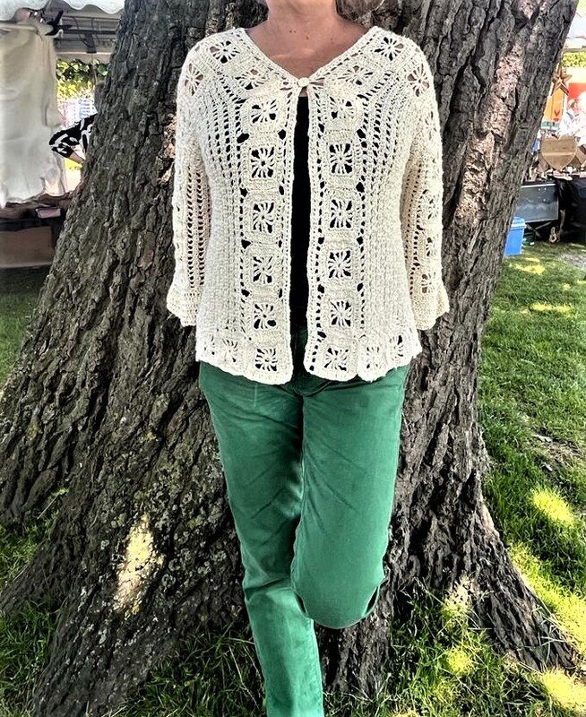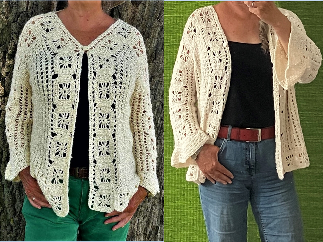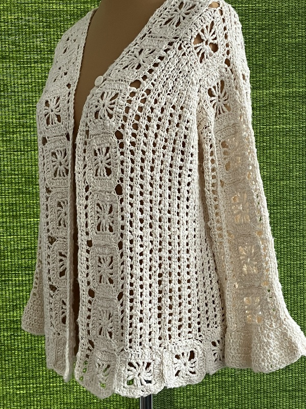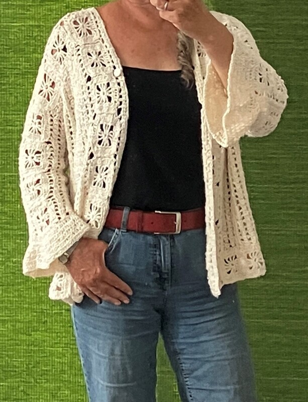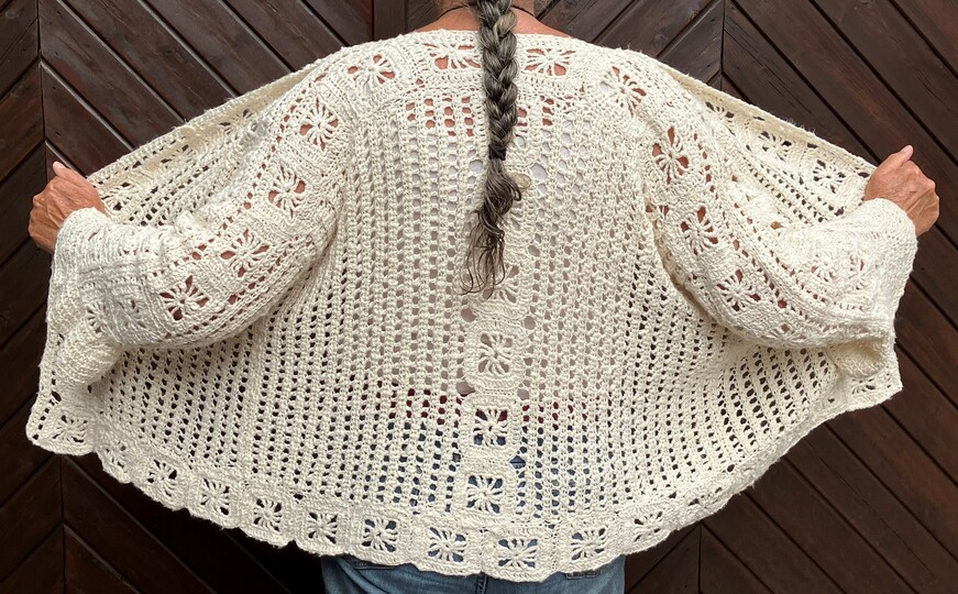 Diese Jacke ziert sich mit Grannys, ohne dass die Grannys alles dominieren. Sie ist so konzipiert, dass sie garantiert für alle passt, egal welche Figur du hast. Denn zunächst ordnet man die Grannys so an, dass sie in Länge und Breite eine optimale Größe für dich bilden. Wie man das macht, wird ausführlich mit vielen Fotos und Häkelschrift erklärt. Du kannst die Jacke mit Knöpfen schließen, ganz ohne Knöpfe tragen oder - wie ich - mit einem Knopf oben. Die Jacke ist von mir mit einem unregelmäßig gedrehten Garn gehäkelt, aber auch klar strukturierte Wolle wie glatte Baumwolle oder Merinowolle sind ideal für diese Jacke.