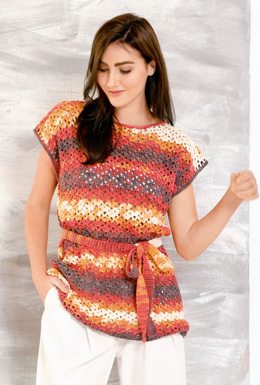 Fehlt noch ein Highlight für den Sommer? Dann ist diese hüftlange Tunika genau das Richtige. Das schöne Farbverlaufsgarn in Rot, Gelb und Weiß erscheint in Streifenoptik, die sich von allein ergibt. Das Muster, bestehend aus Stäbchen und Luftmaschen, ist einfach. Mit Nadel Nr 5,5 bist du relativ schnell am Ziel. Abnehmen musst du nur für den runden Ausschnitt. Beim Zusammennähen bleiben seitlich die Armausschnitte offen. Armausschnitte und Ausschnitt werden mit festen Maschen und Krebsmaschen umhäkelt. Für eine Tragvariante häkelst du dir, wenn du möchtest, aus festen Maschen einen langen Bindegürtel. Das Baumwollgarn gibt es bei ONline in 100 g Knäulen. Die Anleitung gilt für die Größen 38, 40, 42, 44, 46 und 48.
