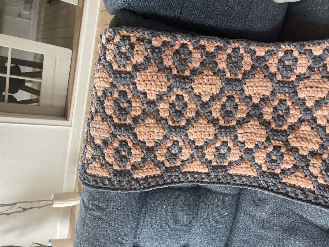 Die Größe ist individuell anpassbar. Das Mosaikmuster kann so lange gehäkelt werden bis Dein Häkelstück die Wunschgröße erreicht hat.
