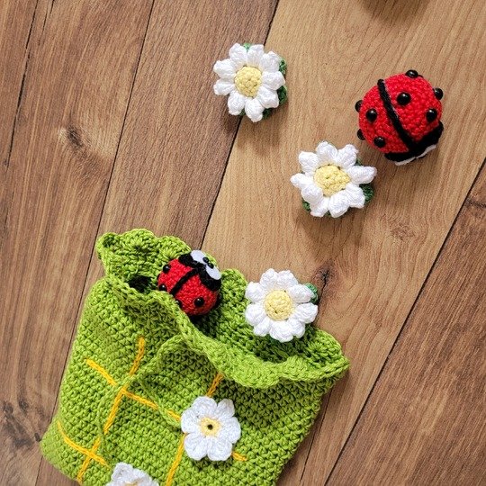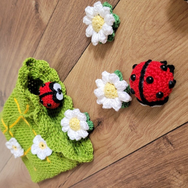 Sie enthält den Beutel, Marienkäfer und Blume.