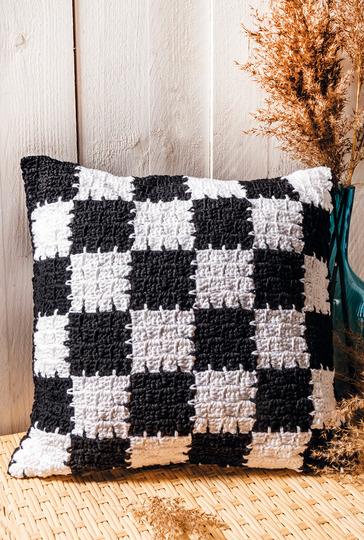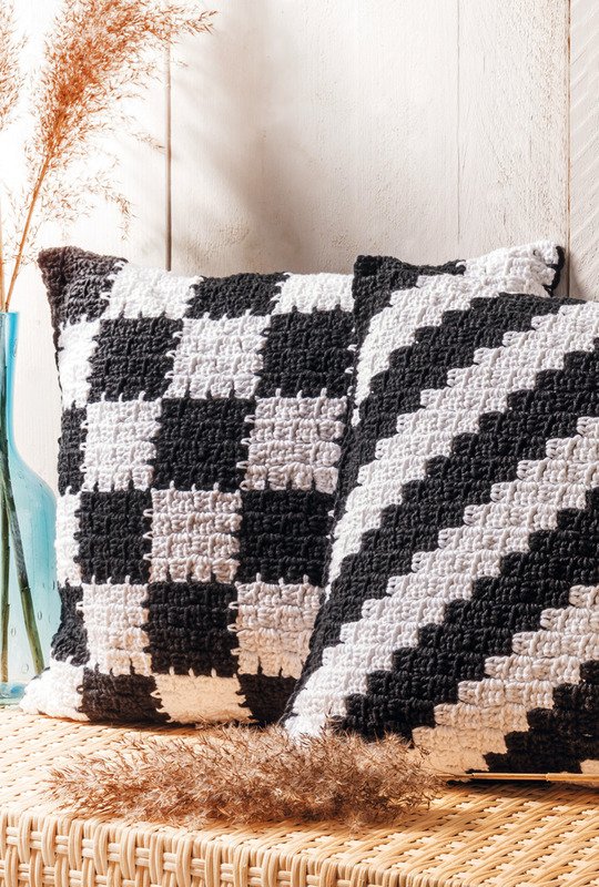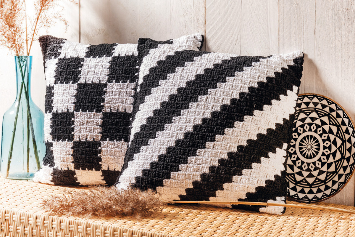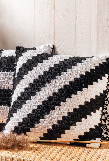 Die Farbkombination aus Schwarz und Weiß erfindet sich immer wieder neu und zaubert monochromen Chic in Ihr Zuhause. Im grafischen Design zeigen sich diese beiden quadratischen Kissen, jeweils 40 x 40 cm, in der Corner to Corner-Technik, das heißt, das Häkelstück wird nicht in einfachen Reihen gehäkelt, sondern diagonal von Ecke zu Ecke, zwischendurch wird immer wieder die Farbe von Schwarz zu Weiß gewechselt. Dies fällt selbst weniger erfahrenen Häklerinnen mithilfe der ausführlichen Anleitung, der Häkelschrift und der Schemazeichnung nicht schwer.
