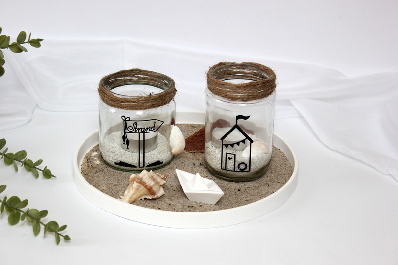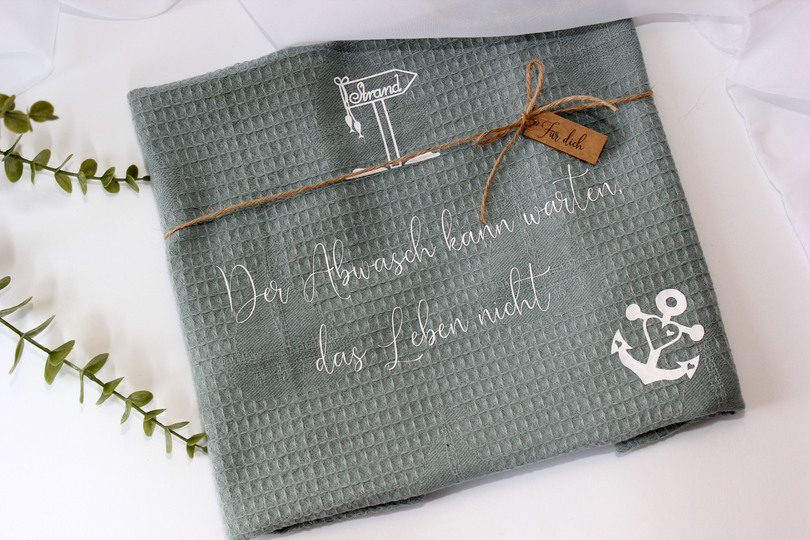 Geschnitten aus Vinylfolie verziert er Gläser und Porzellan für Vasen, Blumentöpfe oder Kerzengläser oder auch Karten, Geschirrtücher und Brotzeitbrettchen.