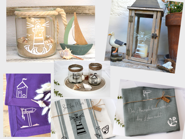 Ein maritimes SET für Meer-Liebhaber: in dem SET sind fünf Motive enthalten, die auch wunderbar mit unserem Muschelset kombiniert werden können: zweierlei Leuchttürme, STrandhaus mit Strandschild, Anker.