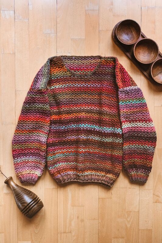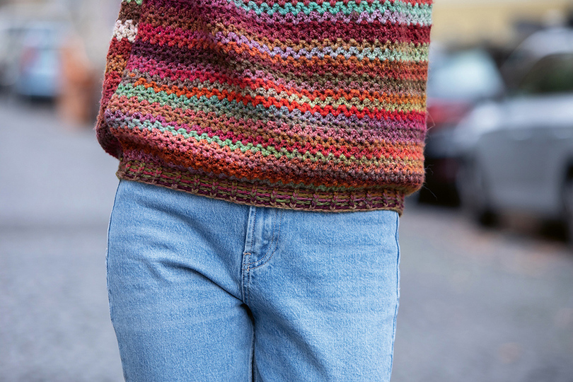 Genau diese Szene spiegeln auch die Farben in diesem wunderschönen Pullover wider. Durch seine leicht löchrige Struktur ist er perfekt für laue Herbsttage, an denen sich die Sonne hin und wieder nochmal zeigt. Gehäkelt mit einem einfachen V-Stäbchenmuster entsteht eine Struktur, die den Pullover fast schon wirken lässt als wäre er gestrickt. Ein absolutes It-Piece für die anstehende Herbstsaison!