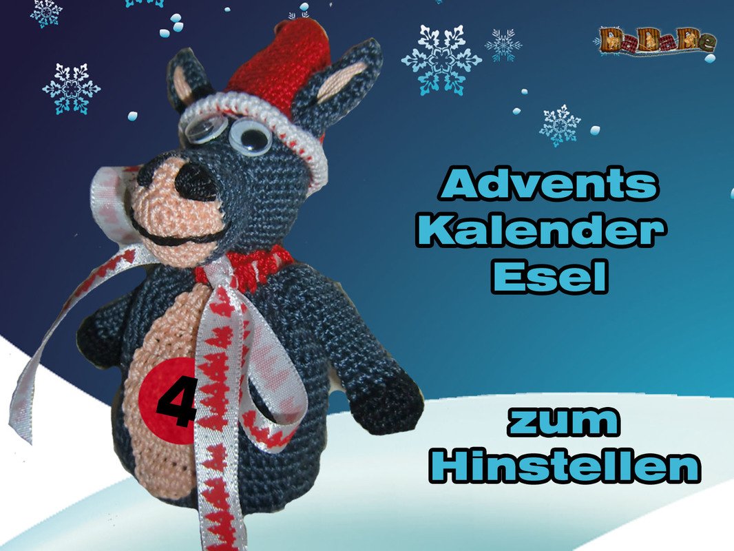 Der Esel, sowie seine Adventskalender-Freunde, Bär, Maus, Pinguin und Rentier,
