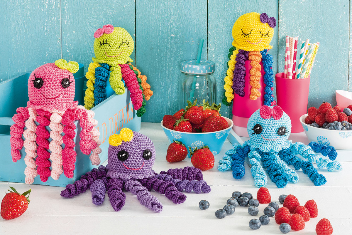 Die lustigen gehäkelten Meeresbewohner fühlen sich an Land sichtlich wohl. Aus einfachen festen Maschen gehäkelt sind die Oktopusse auch von Anfängern gut nachzuhäkeln. Die "gelockten" Fangarme der Tintenfische bestehen lediglich aus Luftmaschen und Stäbchen, wobei einfach mehrere Stäbchen in eine Luftmasche gehäkelt werden. Ob Ton in Ton oder in fröhlich bunten Farben, wie Grün, Apfelgrün, Türkis, Gelb, Orange, Pink, Lila und Blau gehäkelt - hier ist Euer ganz persönlicher Geschmack entscheidend. Mit einfachen Stichstichen werden Mund und Augen aufgestickt. Dies schaffen auch Stick-Neulinge problemlos.
