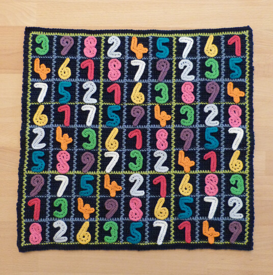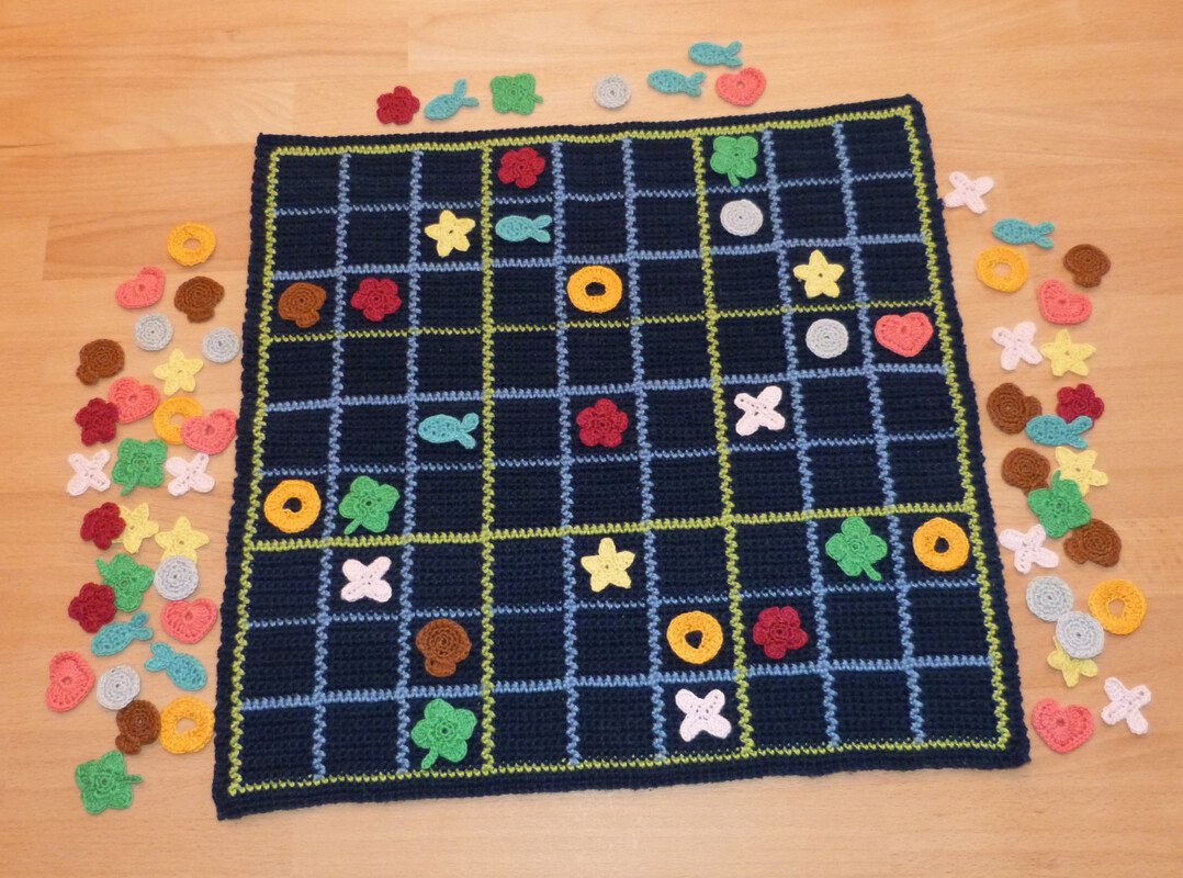 Das Spielfeld ist groß und wird mit 12 Knäueln gleichzeitig gearbeitet! Das ist nicht geeignet für Ungeduldige, da es leicht zu einem Fadengewirr kommen kann!