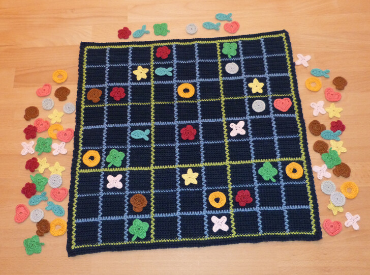 Bei Verwendung von Baumwollgarn mit einer Lauflänge von ca. 125m/50g und Nadelstärke 3 wird das Spielfeld etwa 37 x 38 cm groß. Die Spielsteine werden mit halbem Faden und Nadelstärke 1,5 gehäkelt, damit sie auf das Spielfeld passen.