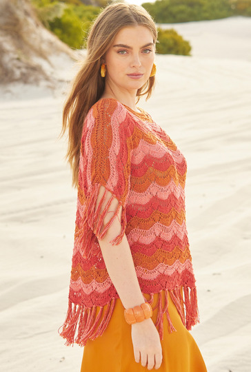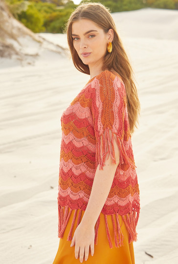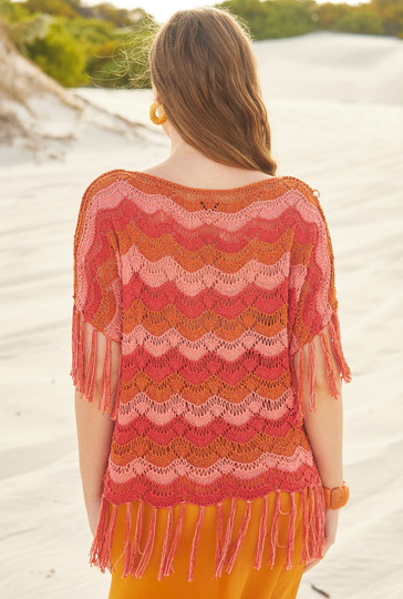 Der Pullover mit angeschnittenen kurzen Ärmeln begeistert mit seinem Wellenmuster in drei Farben. Es ist recht einfach zu stricken; auch der Schnitt aus ganz geraden Teilen ist ganz unkompliziert. Halsausschnit und Armausschnitte sind mit einer Runde Kettmaschen umhäkelt. In Kombination mit den Fransen wirkt er beschwingt und energiegeladen, die harmonisch aufeinander abgestimmten, warmen Farbtöne in Rot, Rosa und Rotbraun verleihen ihm einen femininen Charakter. Die Anleitung für ein Baumwolle-Seiden-Mischgarn steht in den Größen 36 – 42, 44 – 48 und 50 – 54 zur Verfügung.
