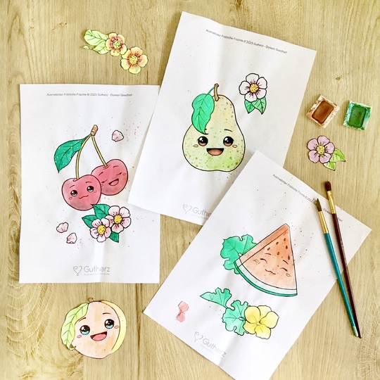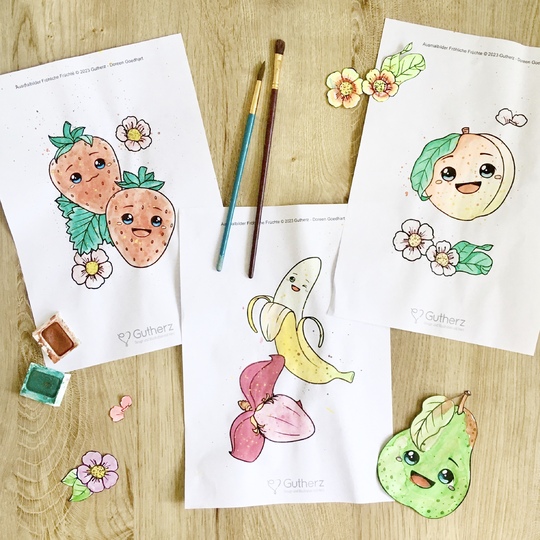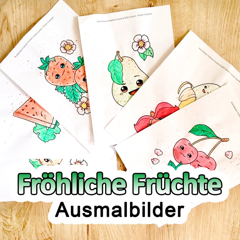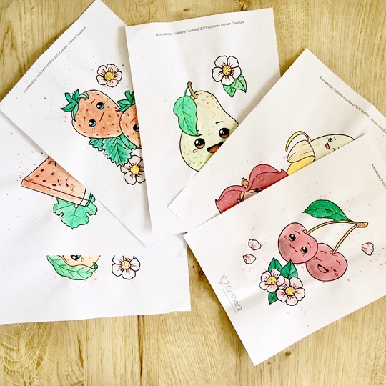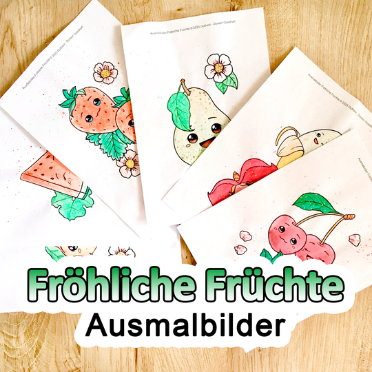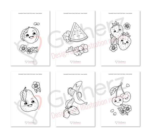 Die Fröhlichen Früchte präsentieren sich auf einer Seite jeweils zusammen mit ihrer Blüte und Blatt (bis auf die Banane). Mal alleine und mal zu zweit lächeln sie dich an und verbreiten gute Laune.