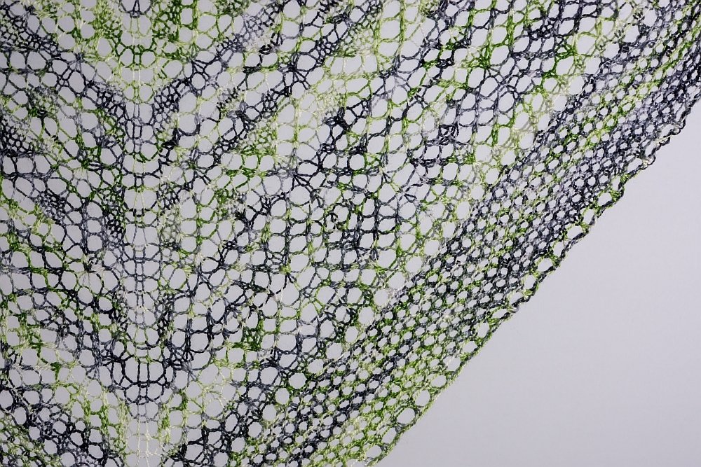 Die einzelnen Muster in diesem Tuch sind zwar nicht schwer, aber es erfordert ein bisschen Konzentration und Übung die Muster über die ganze Breite des Tuches zu stricken.