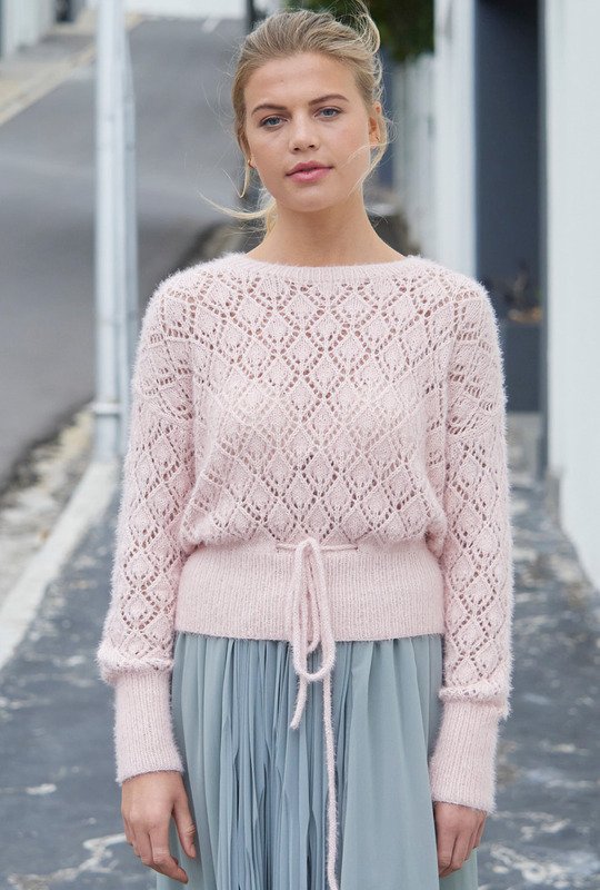 Dieser zarte Pullover wirkt dank des grazilen Ajourmusters in Rautenform besonders elegant. Die Kordel in der Taille und der hohe Bund unterstreichen diesen Look zusätzlich. Die Kordel ist selbstgestrickt als I-Cord. Der geringe Nylonanteil im ansonsten aus Baumwolle bestehenden Kettgarns sorgt für den zarten Flaum. Das Garn lässt sich übrigens sehr gut verstricken. Ohne runde Armausschnitte und mit gerade eingesetzten Ärmeln ergeben sich überfallende Schultern. Auch die Ärmel haben diesen hohen Rippenbund. Eine Anleitung gibt es für die Größen 36/38, 40/42) und 44/46.