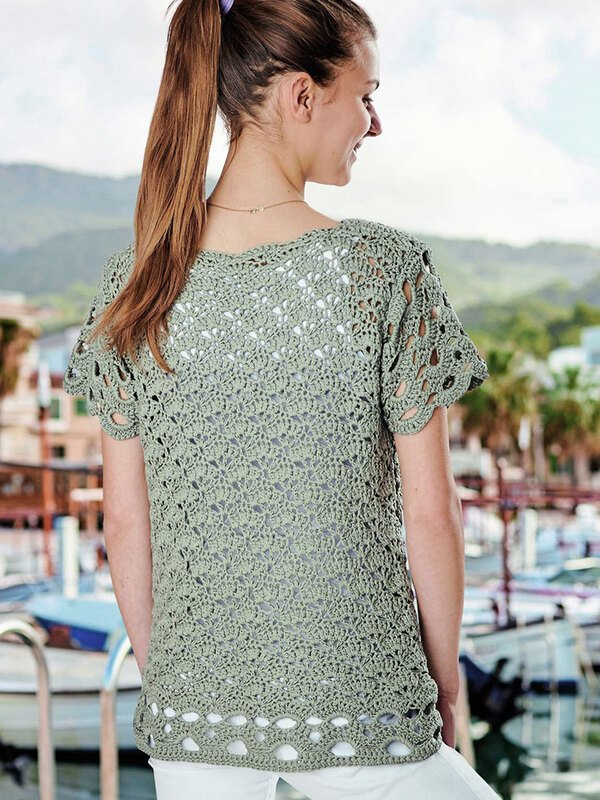 Dieser schöne Sommerpulli hat ein ganz besonderes Muster. Es erinnert ein bisschen an das alleseits bekannte Virusmuster, das in vielen Tüchern zu finden ist. Doch hier zieht es sich geschickt über den ganzen Pulli. An den Ärmeln und am unteren Rand ist es jedoch etwas größer, so dass ein besonders schöner Abschluss entsteht. Die Farbe ist ein neutrales Grüngrau, das zu allen anderen Farben passen wird. Ganz toll ist die Kombination mit einer Weißen Hose und T-Shirt darunter. Es wirkt besonders frisch und gleichzeitig edel. Das Bändchengarn ist aus Baumwolle und so schön leicht für den Sommer.