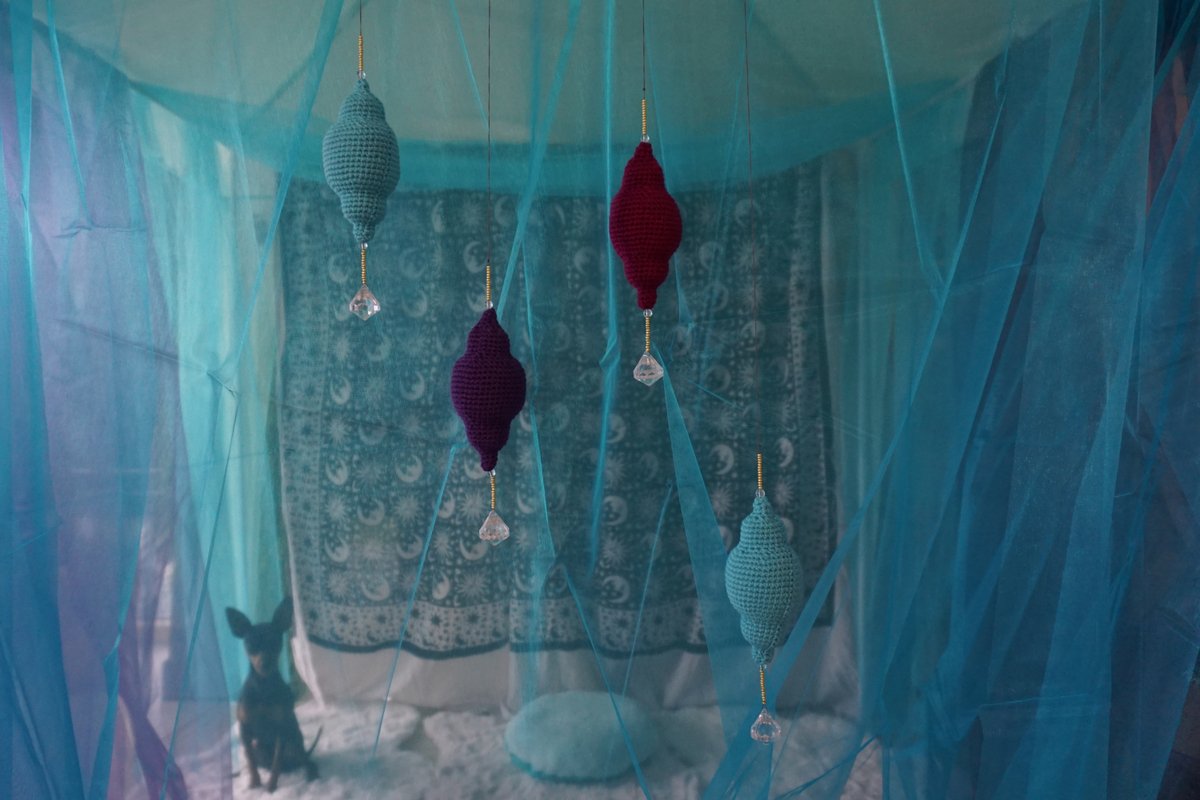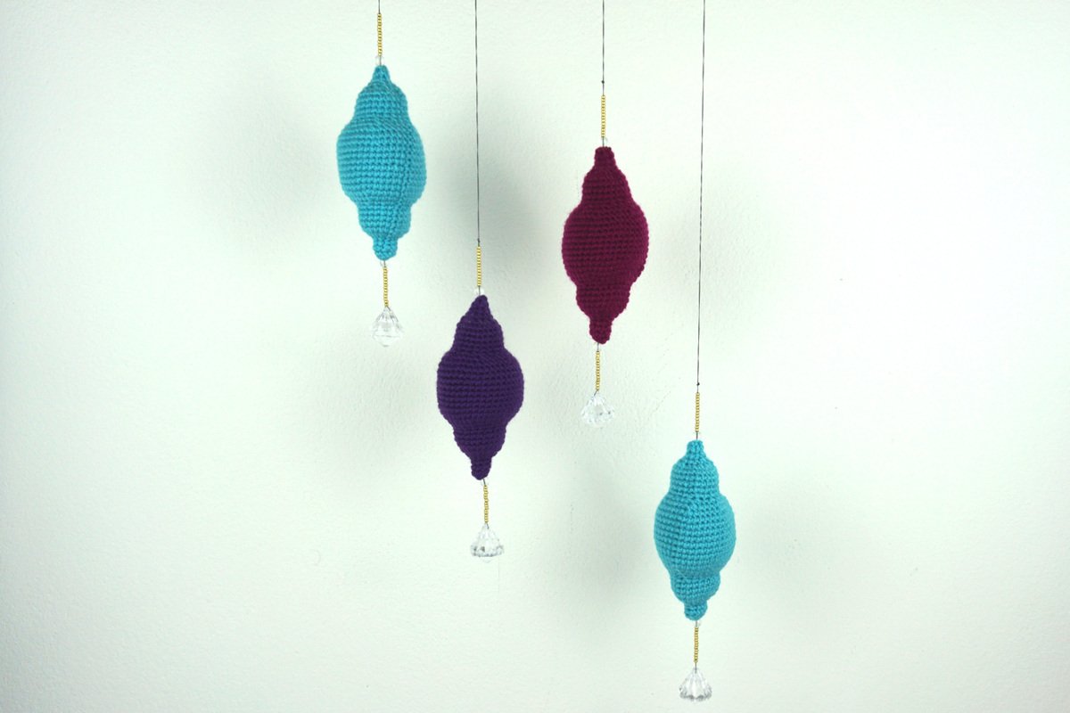 Die Hängedeko wird mit angegebener Wolle und den Perlen ca. 20 cm hoch.
