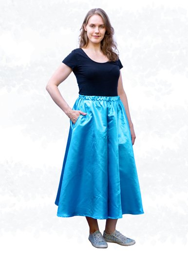 „Ronja“ lässt sich aus verschiedenen Web- und Maschenwaren nähen. Der Saum kann umgeschlagen und abgesteppt oder mit einem Rollsaum versehen werden, was ihm einen verspielten Touch verleiht.