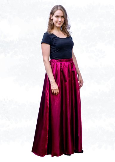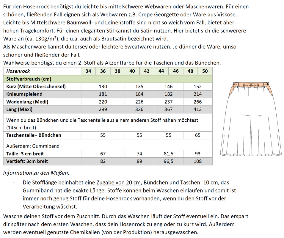 Für den Hosenrock benötigst du leichte bis mittelschwere Webwaren oder Maschenwaren. Für einen schönen, fließenden Fall eignen sich als Webwaren z.B. Crepe Georgette oder Ware aus Viskose. Leichte bis Mittelschwere Baumwoll- und Leinenstoffe sind nicht so weich vom Fall, bietet aber hohen Tragekomfort. Für einen eleganten Stil kannst du Satin nutzen. Hier bietet sich die schwerere Ware an (ca. 130g/m²), die u.a. auch als Brautsatin bezeichnet wird.
