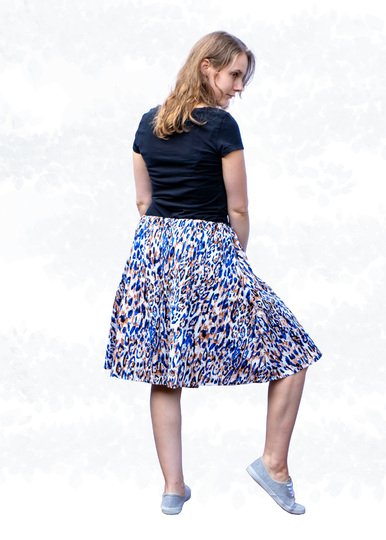• Und natürlich das eigentliche Schnittmuster selbst, und zwar sowohl im A4- als auch im A0-Format als PDF. Du hast die Wahl zwischen einem Einzelgrößenschnitt mit Nahtzugaben und einem Mehrgrößenschnitt, den es in bunten und schwarz-weißen Versionen gibt - natürlich auch mit Nahtzugabe. Wenn du nur den kurzen oder knielangen Hosenrock nähen möchtest, kannst du diese statt der langen Version ausdrucken. Das spart Papier.