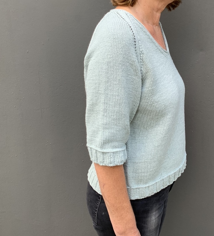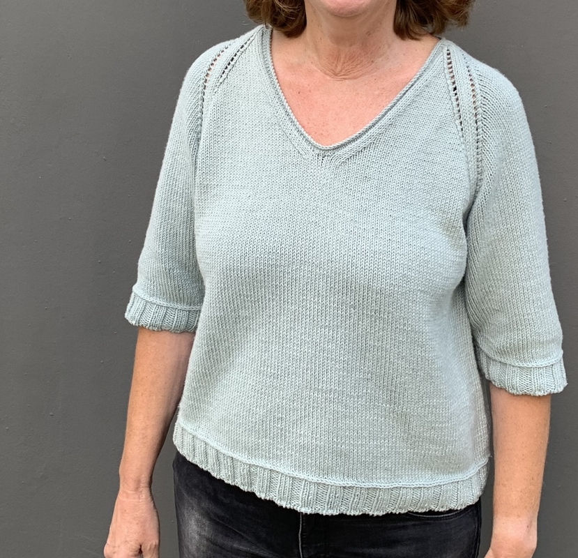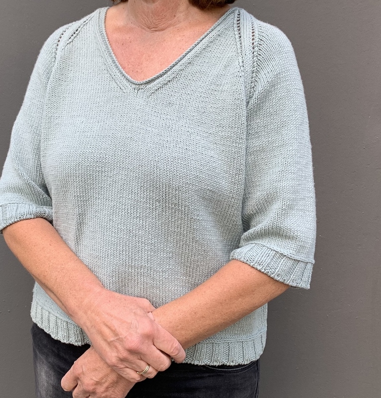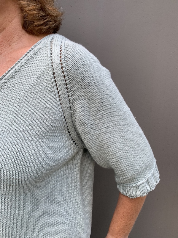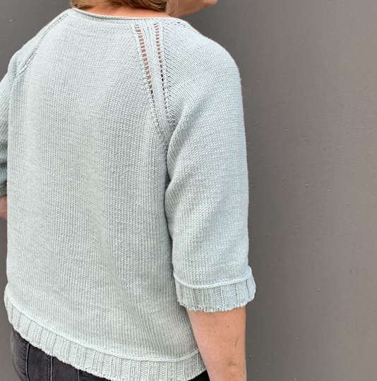 Der Pullover wird komplett von unten nach oben gearbeitet. Die lang gezogene Raglanlinie mit dem Lochmuster geben dem Pulli eine gewisse Lässigkeit. Der Körper ist relativ kurz, kann aber ohne Weiteres angepasst werden. Die jeweiligen Querreihen über den Bündchen werden mit Hilfe von Fotos in der Anleitung genau erklärt.