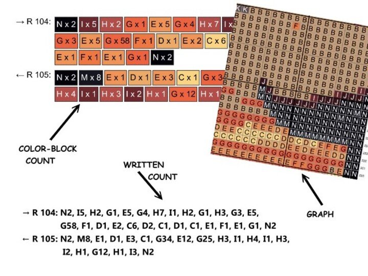 -farbige Zahlen-Blöcke für jede Reihe für feste Maschen (Stb od. hStb)