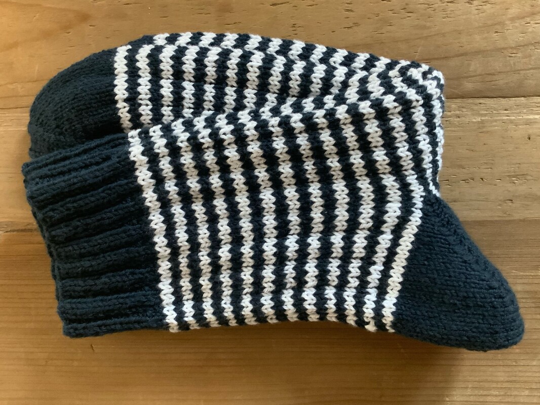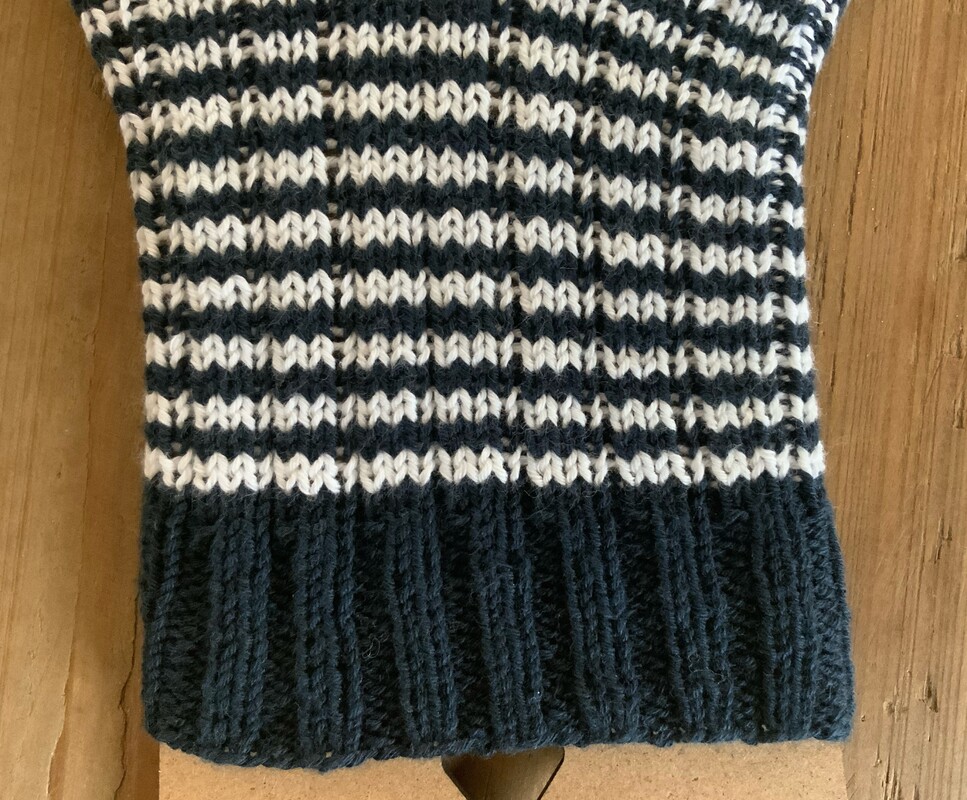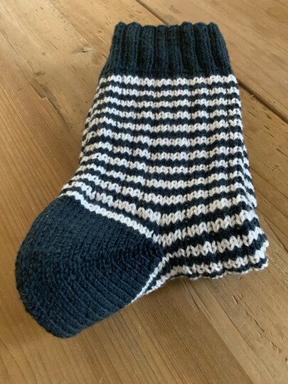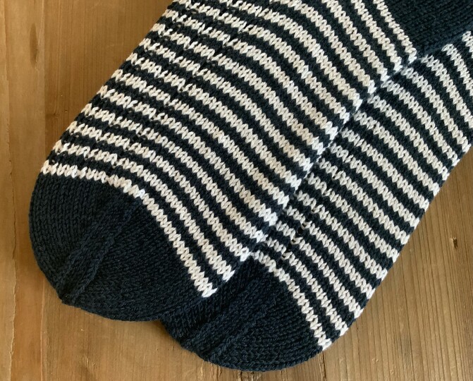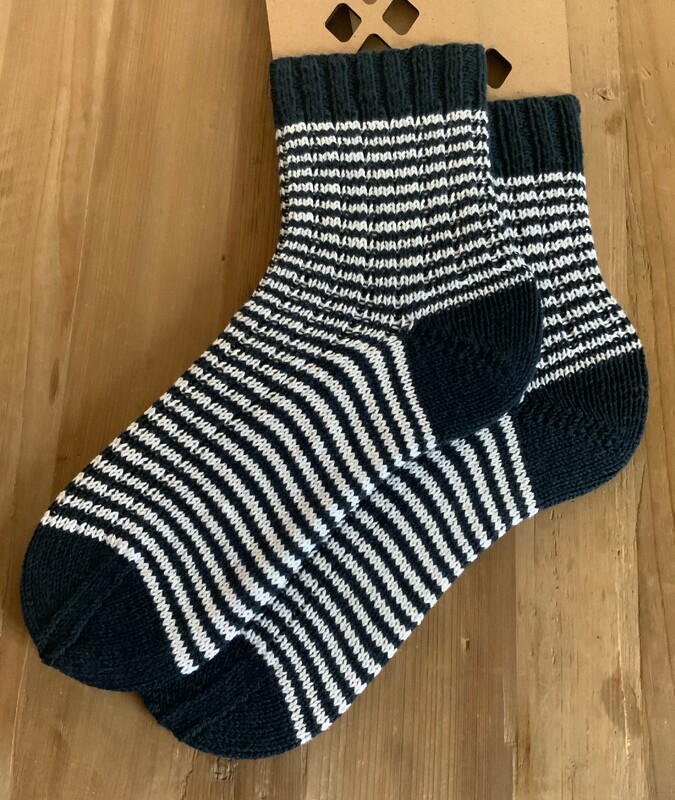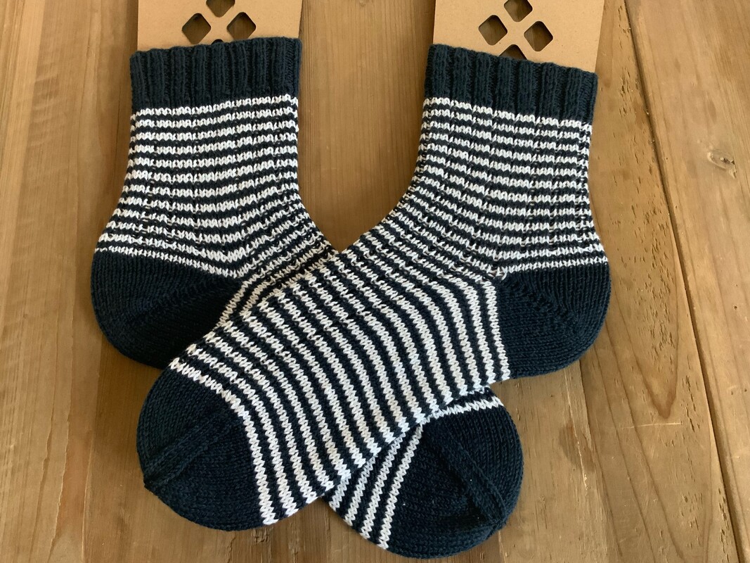 „Bluette“, Sommer-Socken mit den klassischen maritimen blau-weißen Streifen. Die Socken werden von oben nach unten in einem einfachen Strukturmuster gestrickt. Ich habe die Ferse als Bumerangferse gearbeitet und eine Bandspitze gestrickt und beschrieben. Ferse und Spitze können jedoch auch anders ausgeführt werden.