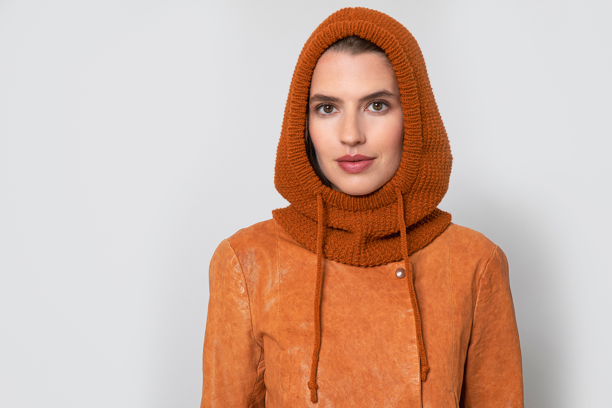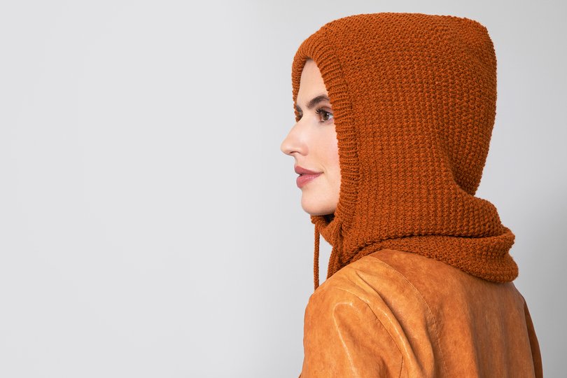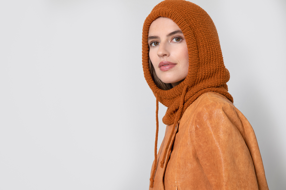Die Balaclava-Mütze Structure fällt locker um das Gesicht. Die Bänder sind ein raffiniertes Detail.