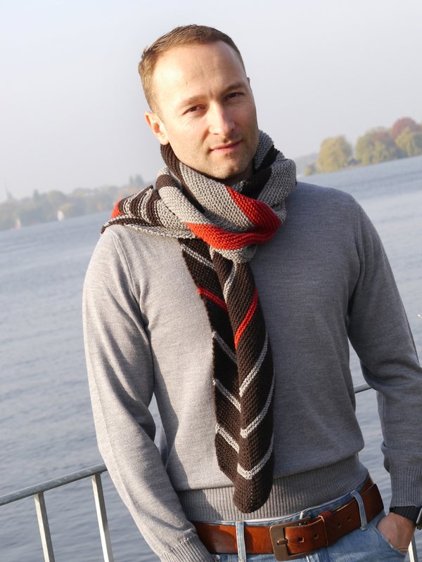 Männer zu bestricken ist eine Wissenschaft für sich – sie haben nämlich eine sehr genaue Vorstellung davon, was ihnen NICHT gefällt. Mein Tipp: Beziehen Sie den Mann, den Sie beschenken wollen, von Anfang an mit ein und schleppen Sie ihn in einen Wollladen. Rolo, Conny (die Ladenbesitzerin) und ich hatten eine Menge Spaß, und am Ende entschied sich Rolo für ein Garn und Farben, die ich nicht in Erwägung gezogen hätte. Herausgekommen ist ein ziemlich cooler Schal für einen ziemlich coolen Kerl. Finde ich jedenfalls. Und Rolo auch.