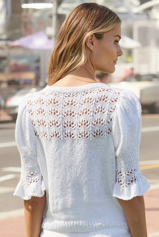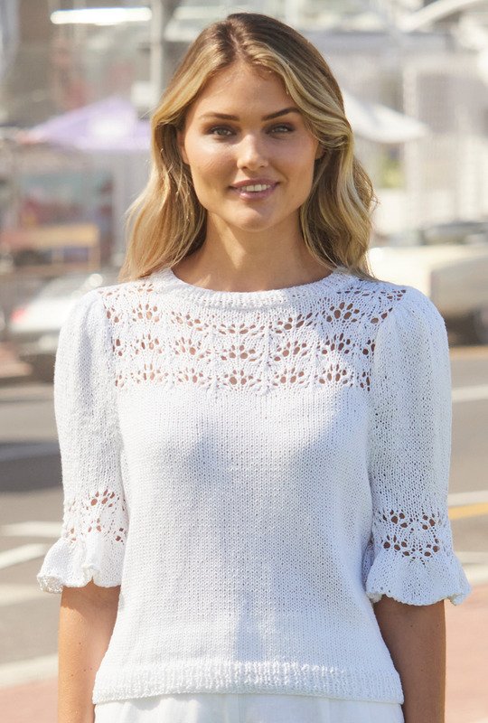 Dieser weiße Kurzarmpulli aus einem Baumwolle-Viskose-Polyacryl-Mischgarn mit dezentem Glanz lebt von seinen femininen Details. Eine Passe im Ajourmuster, das auch nach den Volants der Ärmel gestrickt wird, sowie die runden Puffärmel ziehen die Blicke auf sich. Ansonsten wird glatt rechts gestrickt. Die Weite der Ärmel entsteht durch in der Ärmelmitte herausgestrickte rechts verschränkte Maschen. Ein halsnaher, runder Ausschnitt bekommt am Ende noch eine schmale Blende aus 1 rechts, 1 links gestrickten Rippen. Die Anleitung dafür gibt es für die Größen 36/38 (40/42) 44/46.