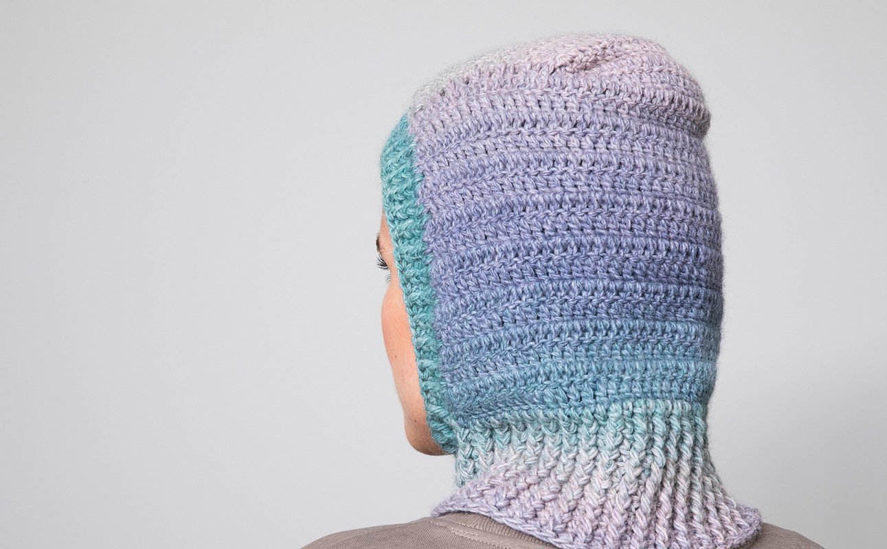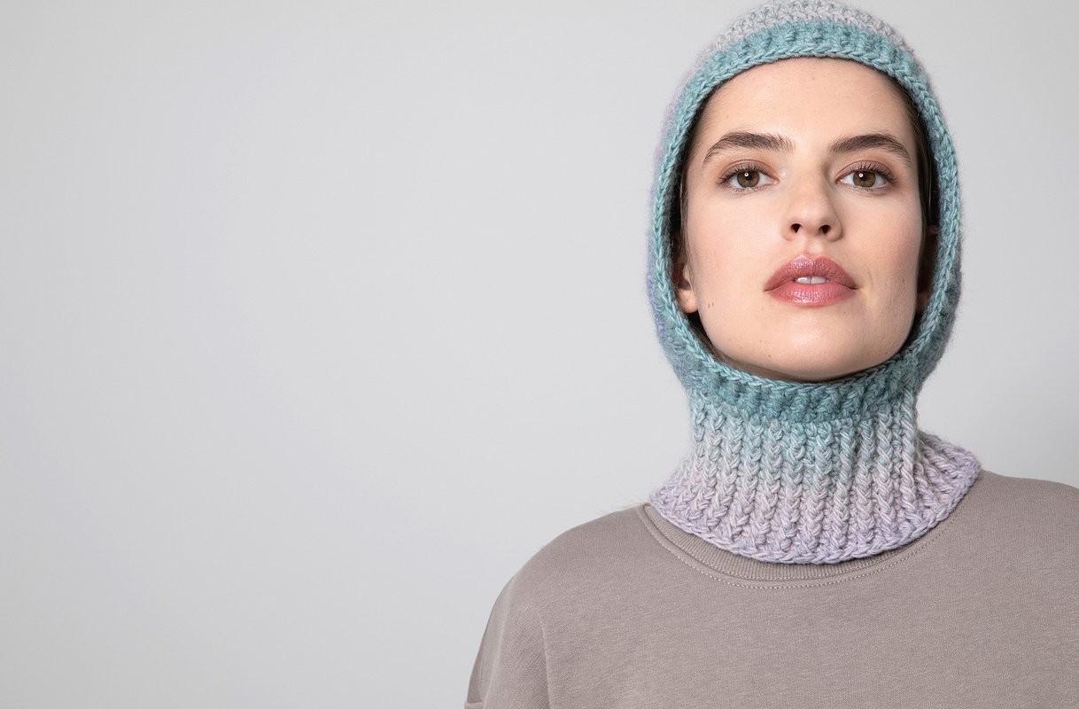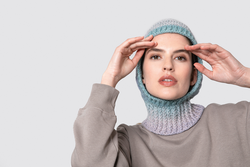 Die Balaclava-Mütze "DÉGRADÉ" fällt etwas lockerer um das Gesicht. Durch das engere Bündchen am Hals bekommt die Mütze eine angenehme Passform und hält warm. Der Farbverlauf des Garns lockert das minimalistische Design auf und erzeugt ein spannendes Muster.