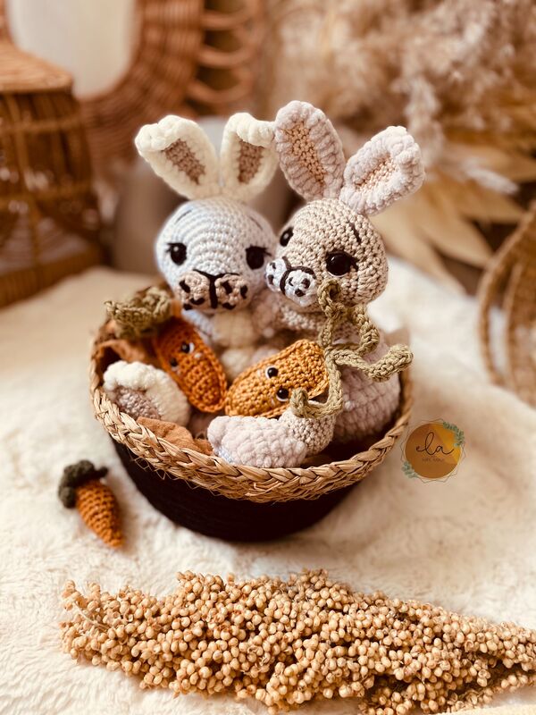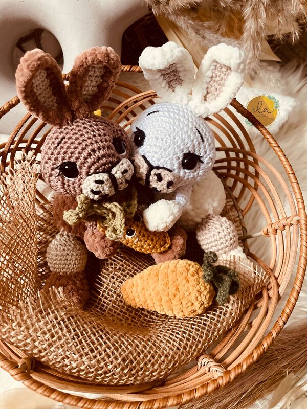 Mit dieser Anleitung Kannst du dir die Zwei süßen Häschen Hoppel und Frieda mit ihrem Möhrchen häkeln.