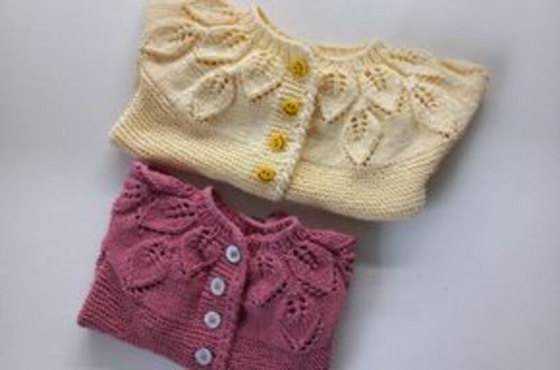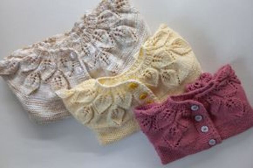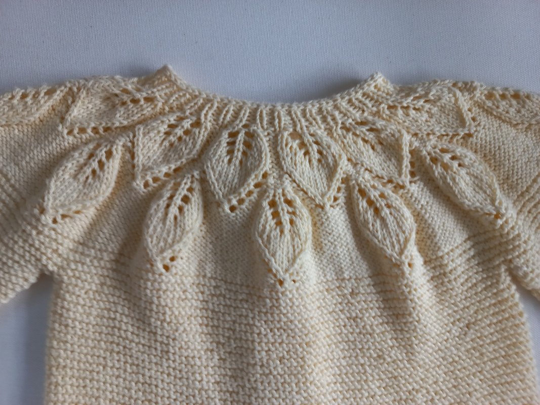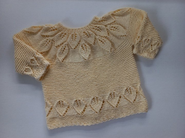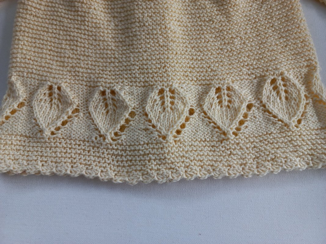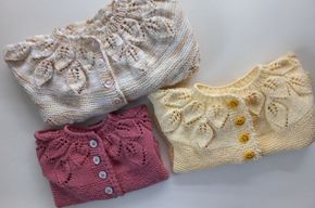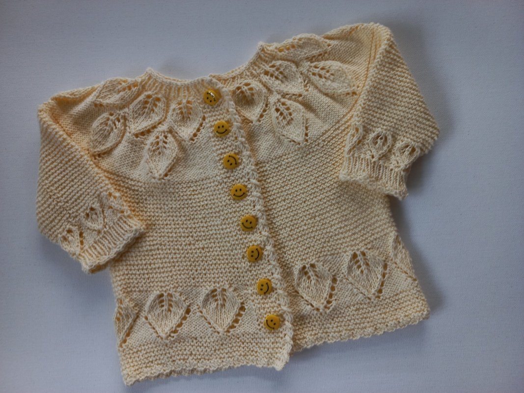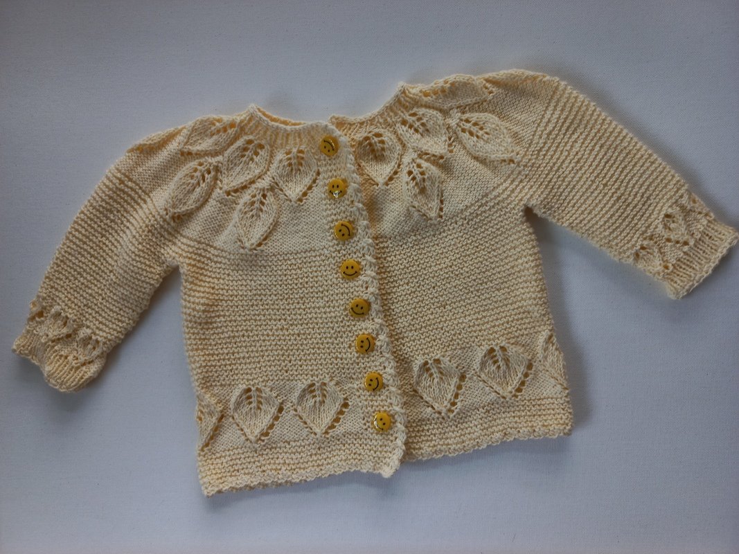 Hier bekommst du eine bis ins kleinste Detail erklärte Strickanleitung in deutsch für eine süße Baby-Kinderjacke, Übergangsjacke aus reiner Baumwolle , in 7 Größen, Anleitung "Reihe für Reihe" mit wunderschönen Blättermotiven an der Rundpasse, am Saum und an den Ärmeln.