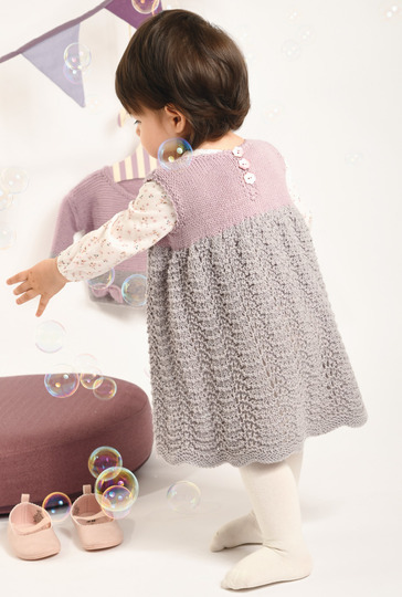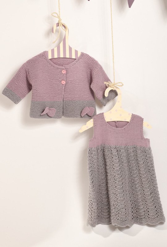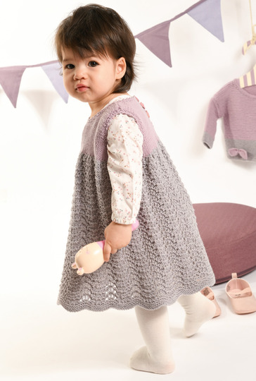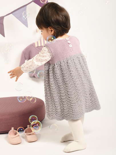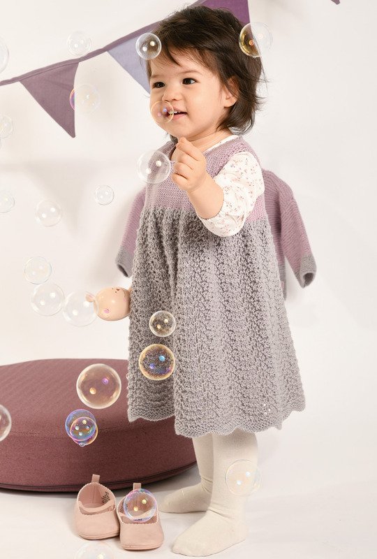 Rosa und Grau sind einfach ein perfektes Doppel! Ob nun einzeln oder zusammen getragen, in diesem Kleidchen mit weitem Ajourmuster-Rock und der kurzen, kraus gestrickten Jacke fühlen sich kleine Mädchen sicher immer wohl. Besonders süß sind die beiden Schleifchen vorne am Jäckchen. Ganz praktisch lässt sich das Kleid hinten in der Passe auf- und zuknöpfen. Mit dieser ausführlichen Strickanleitung inkl. Strick- und Schnittmuster lassen sich das Kleidchen und die Jacke in den Größen 62-92 auch für etwas ungeübtere Strickerinnen problemlos nacharbeiten.