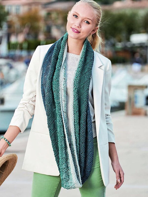 Die Farben dieses Loops spiegeln das Meer und die Unterwasserwelt wieder und erinnern an die Tiefsee. In dem Loop erkennen wir die Gischt, die verschiedenen Blau und Grüntöne der Wellen und in weiter Ferne die Tiefe des Oceans. Sogar das Muster deutet Wellen oder Muscheln an und ist dabei so einfach zu erlernen. Der Loop ist groß genug um ihn wahlweise um die Schultern zu tragen oder ihn doppelt um den Hals zu schlingen. Egal wie, kuschelig warm hält er einen bei der Briese, die immer am Meer weht. Darum ist dieser Loop ein Muss im Reisekoffer.