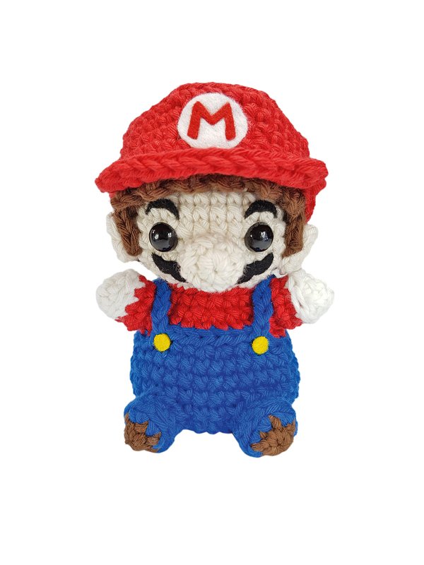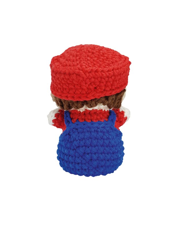 Diese Amigurumi-Figur stellt den Hauptcharakter aus einem berühmten Videospiel dar. In diesem Videospiel schlüpft man in die Rolle des italienischen Klempners und muss verschiedene Aufgaben bewältigen, Rätsel lösen und Hürden überwinden um die Prinzessin der Spiel-Welt zu retten.