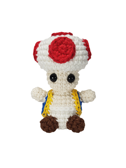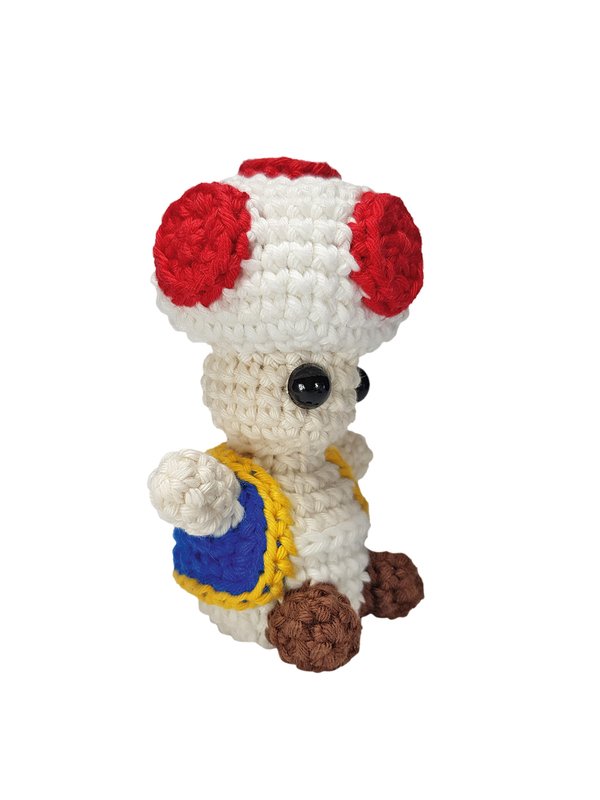 Diese Amigurumi-Figur stellt den Charakter aus einem berühmten Videospiel dar. Der Charakter stellt ein kleines Pilzmännchen dar. Er ist ein kleiner Fliegenpilz, der in dem Videospiel zwar eher eine Nebenrolle als Berater und Diener spielt, dennoch aber auch ein guter Freund der Prinzessin ist. Mittlerweile hat er auch sein eigenes Videospiel.