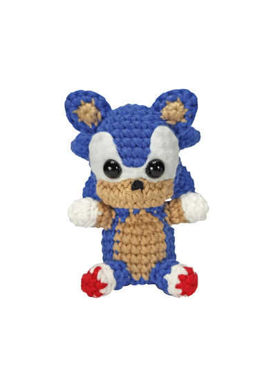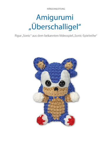 Diese Amigurumi-Figur stellt einen Charakter aus einer berühmten Videospielreihe dar. Der Charakter ist ein Überschalligel welcher ein kleiner blauer Igel mit rebellischem Charakter ist, der sehr flink unterwegs ist. Sein Ziel ist es, Edelsteine mit seinen Kräften einzusammeln, bevor sein Gegner, ein böser Wissenschaftler, sie findet. Dazu springt, rennt und kämpft sich der schnelle Igel durch verschiedene Zonen und gibt sein Bestes!