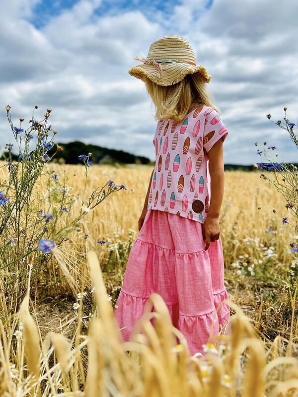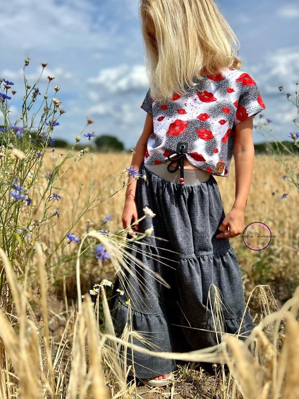 Mit diesem Exemplar, Phoebe, kannst du einen wundervollen Maxirock in geraffter Stufenoptik nähen – und das aus Jersey ebenso wie aus Webware.
