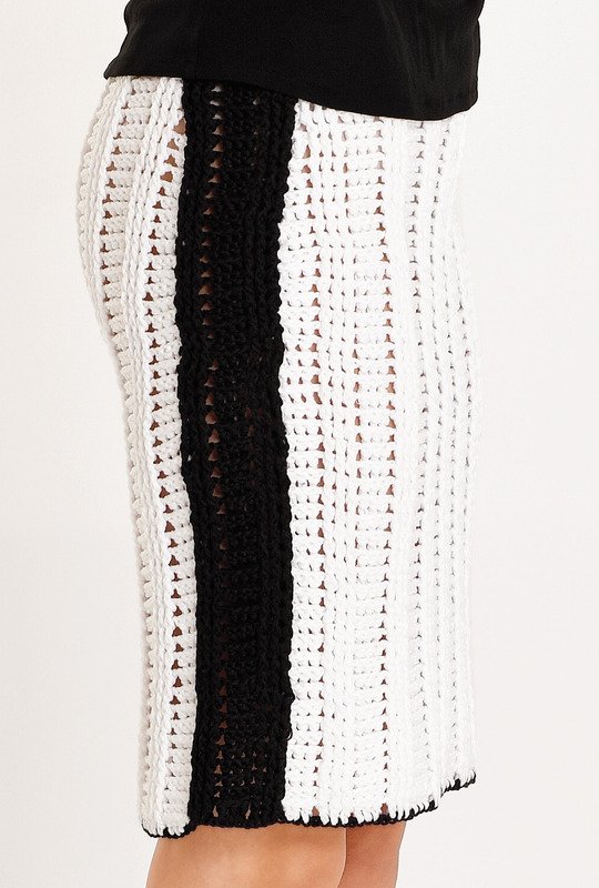 Unverzichtbar! Dieser Etuirock ist ein Allrounder. Ob im Business, zum City-Trip oder in der Freizeit: dieser Rock ist vielseitig tragbar. Im Reliefstäbchen-Muster gehäkelt hat er eine leichte Transparenz. Wer möchte, zieht einen Unterrock an. Erst werden der weiße vorderer und hintere Rock gehäkelt. Der hintere hat einen Schlitz, in den zum Schluss der Reißverschluss eingenäht. Anschließen häkelst Du die schwarzen Galonstreifen. Sie werden dann zwischen den vorderen und hinteren Rock genäht. Hast du die Ränder sauber gearbeitet, kannst du die Teile auch aneinander häkeln. Du arbeitest mit Nadel Nr 4,5 und Garn von ONline. In der Anleitung findest du die Größen 38, 40, 42, 44, 46 und 48.