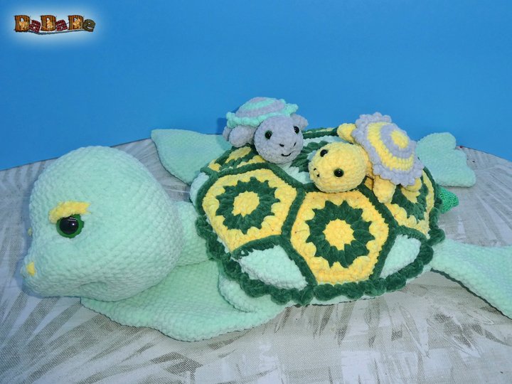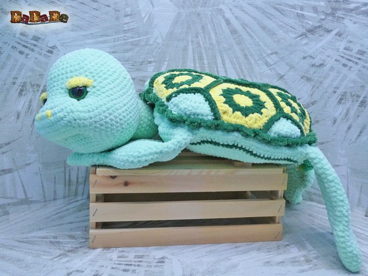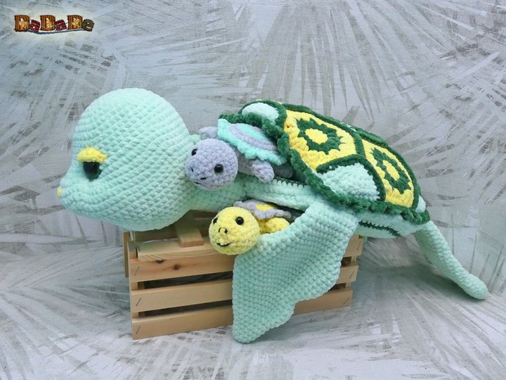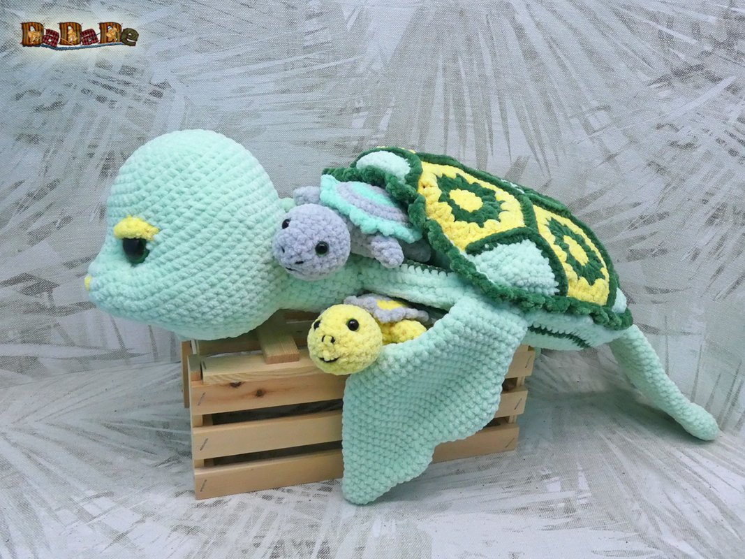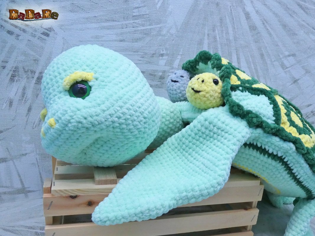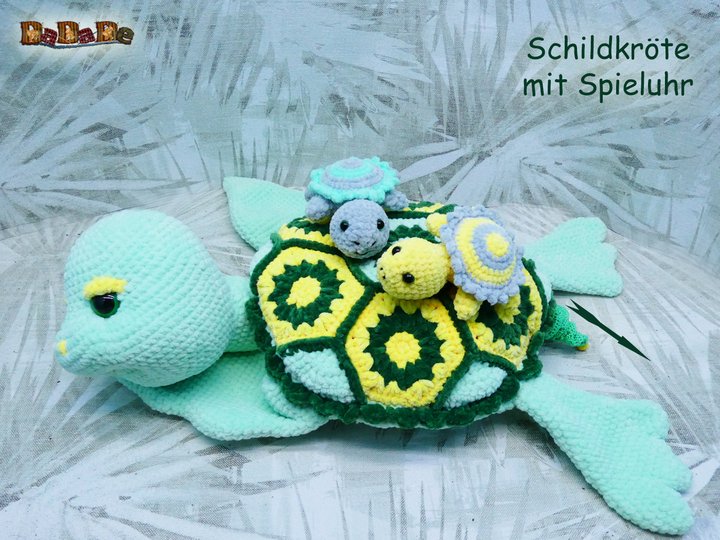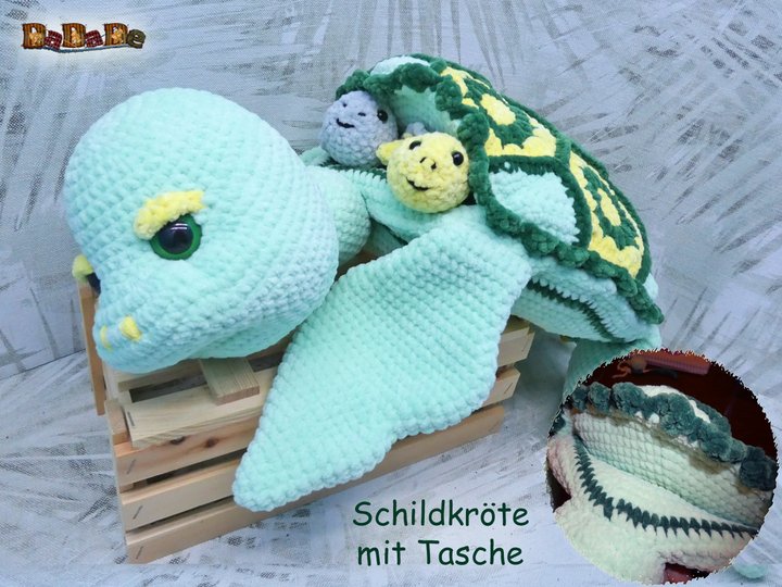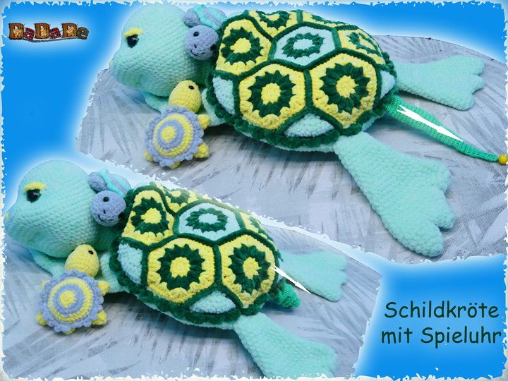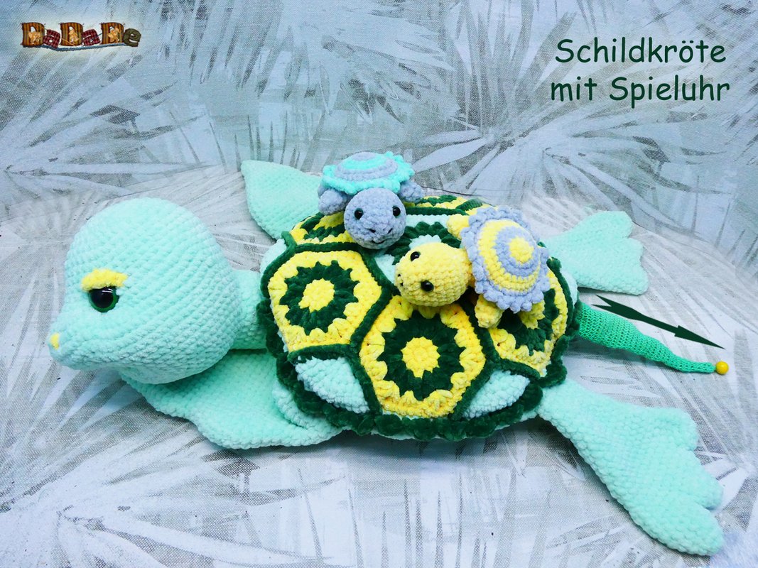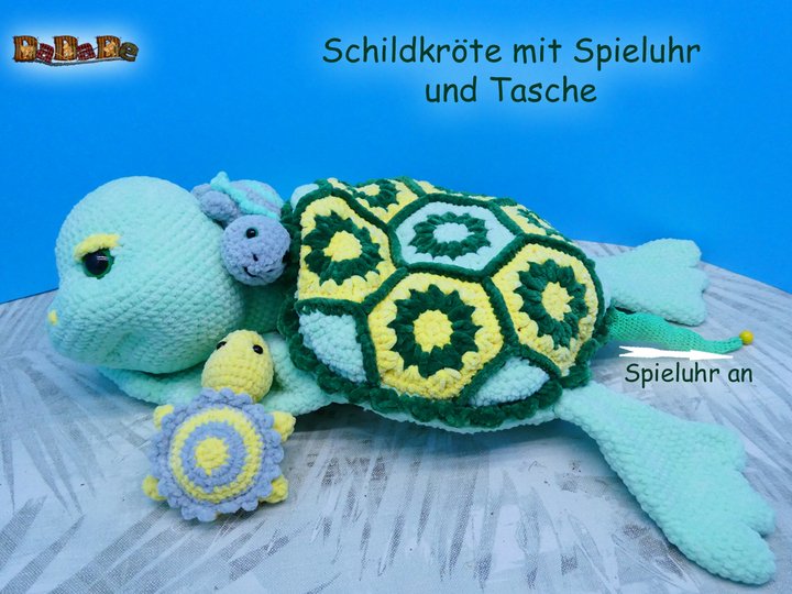 Hier kauft man nur die Häkelanleitung für diese süße Schildkröte mit Spieluhr, Tasche und Baby´s