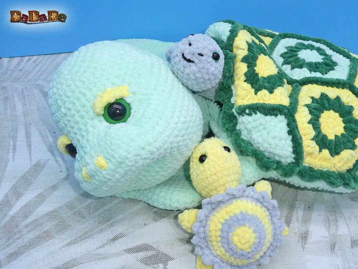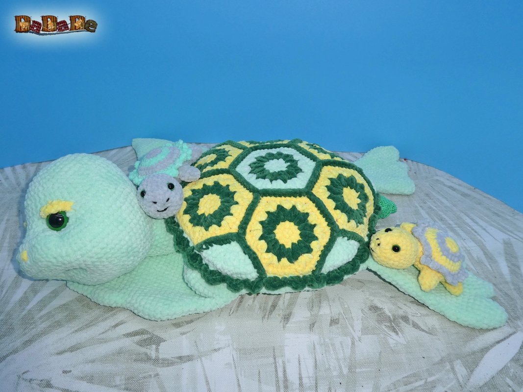 Mit der Nadelstärke 4 wird die Mama Schildkröte ungefähr; Kopf 16cm hoch, ca 60cm breit mit Paddeln, ca 60cm lang