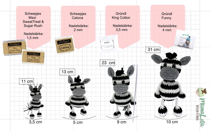 Wenn ihr euch schon immer gefragt habt, ob so ein kleiner Schlüsselanhänger auch in Mini, Midi oder Maxi wirkt, dann habe ich die passende Antwort für euch – ja das tut er! Ich habe mir dieses Mal die Mühe gemacht und ihn für euch in vier gängigen Garnstärken gehäkelt. So habt ihr als Entscheidungshilfe den direkten Vergleich.