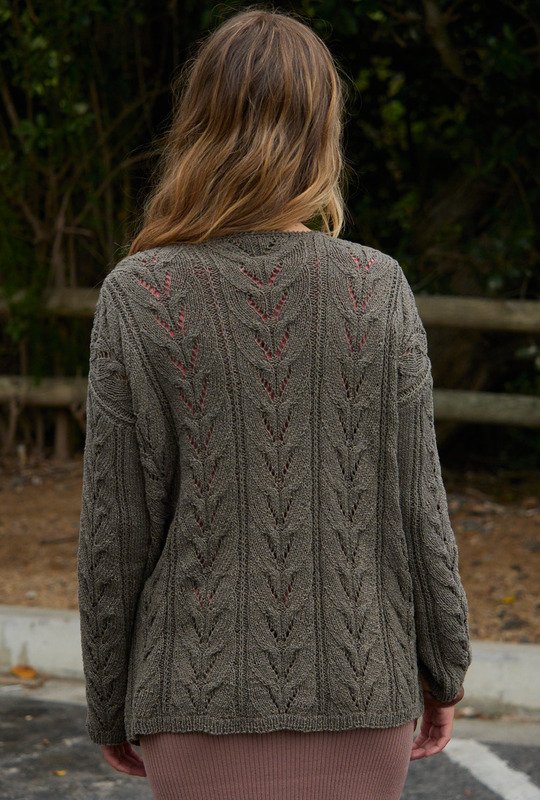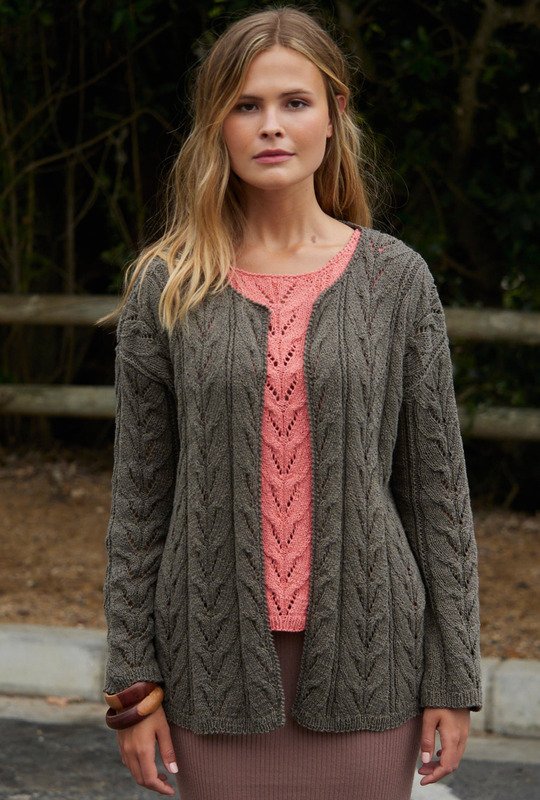 Bei dem Oversize-Twinset ist das Ajourmuster clever positioniert: Das ärmellose Top hat lediglich einen Musterstreifen in der Mitte, der jedoch, wenn Top und Jacke als Twinset getragen werden, das Allover-Muster der Jacke optisch weiterlaufen lässt. Solo dagegen wirkt es sehr dezent. Als Garn kommt ein Leinen-Baumwolle-Gemisch infrage, das sich auf der Haut sehr angenehm anfühlt und sich gut verstricken lässt. Die Vorderteilkanten und der Halsausschnitt des verschlusslosen Cardigans sowie die Arm- und Halsausschnittränder des Tops werden zum Schluss mit festen Maschen und Krebsmaschen umhäkelt, was einen femininen Eindruck hinterlässt. Die Anleitung kann für die Größen 38/40, 42/44 und 46/48 downgeloadet werden.