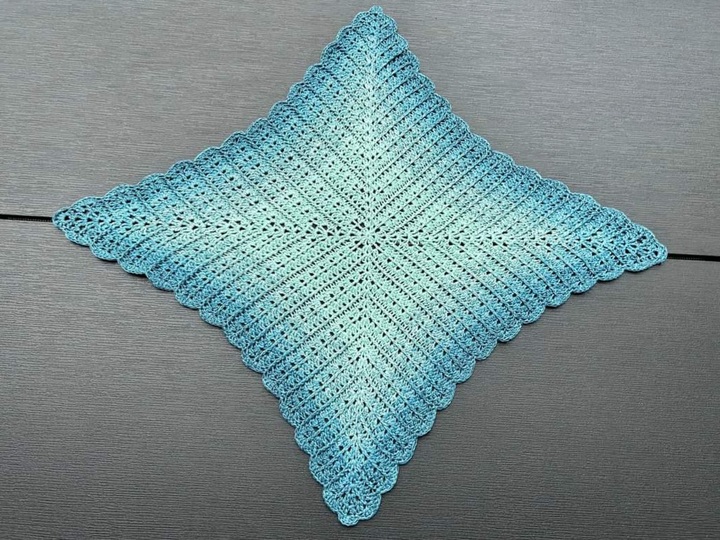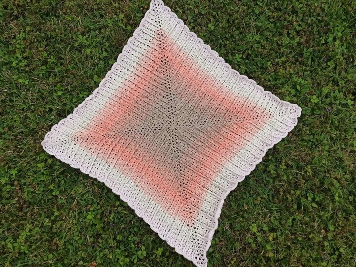 Die Tischdecke eignet sich hevorragend für Farbverlaufsgarn und kann ab 500m Lauflänge gehäkelt werden.