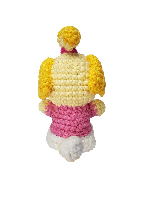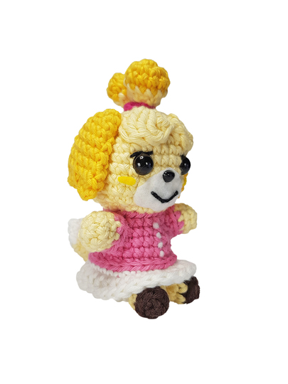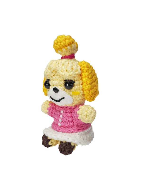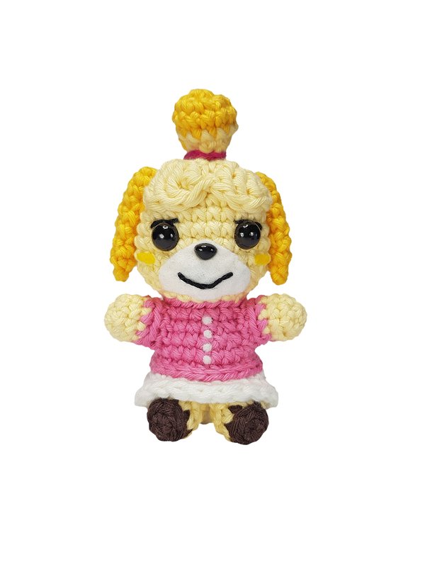 Diese Amigurumi-Figur stellt eine Hundeassistentin aus einem berühmten Videospiel dar. Das Videospiel ist eine Lebenssimulations-Spielreihe, in der der Avatar des Spielers in ein Dorf zieht, welches von vermenschlichten Tieren bewohnt wird. Ziel des Spiels ist es sein Dorf zum schönsten Wohnort für seine Bewohner zu machen und die Probleme der Bewohner zu lösen und sie zufrieden zu stellen. Die Hundeassistentin ist eine Dorfbewohnerin und die Assistentin des Bürgermeisters. Sie legt viel Wert auf die Verschönerung des Dorfes und die Zufriedenheit der Bewohner.