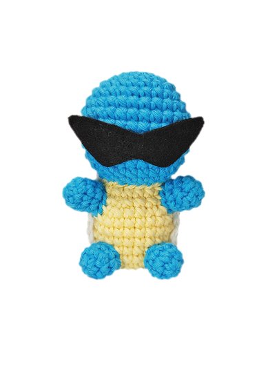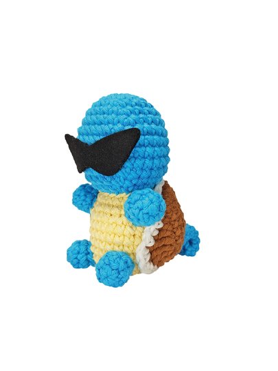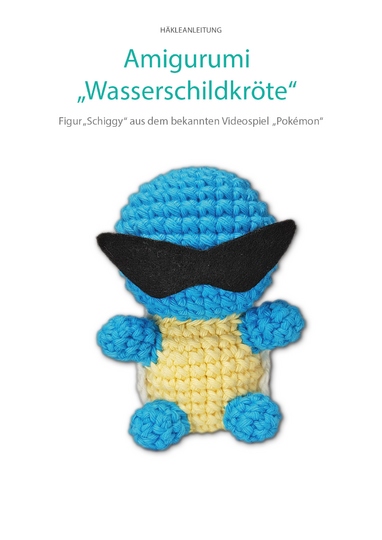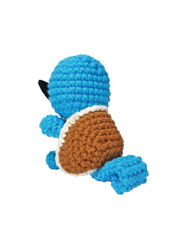 Diese Amigurumi-Figur stellt eine Wasserschildkröte aus einem berühmten Videospiel dar. In dem Videospiel gibt es fiktive Wesen, die auf Tieren und Gegenständen basieren. Mittlerweile gibt es 800 verschiedene von ihnen, sie leben in der Wildnis oder werden gezüchtet. In dem Videospiel versetzt man sich in die Rolle eines Trainers, der herrumreist und diese Wesen fängt und trainiert. Ziel des Spiels ist es, so viele verschiedene Wesen zu finden wie möglich. Die Wasserschildkröte ist eine dieser Wesen und kann wegen ihrem stromlinienförmigen Panzer besonders schnell durchs Wasser schwimmen.