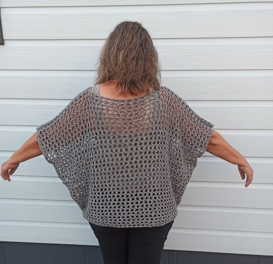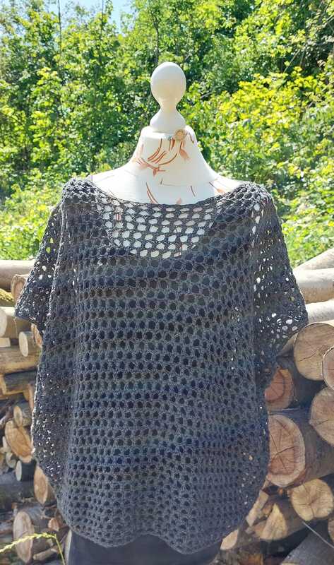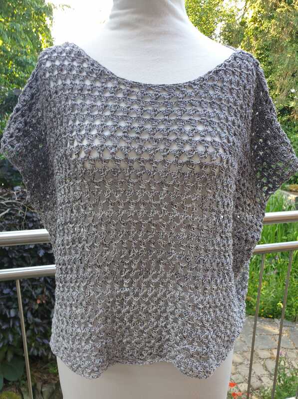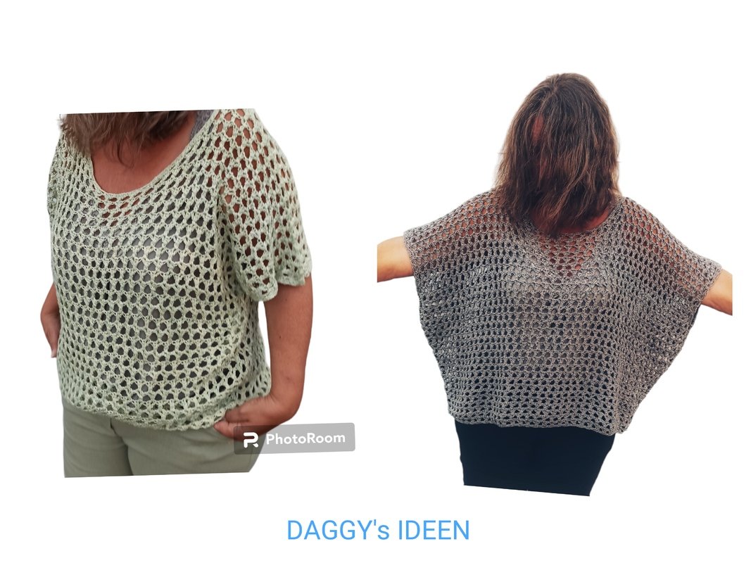 Das Shirt auf dem Titelbild ist in Gr. 40/42 und wurde aus einem 5 fädigen melierten Garn mit einer Lauflänge von 1.300 m und einer Häkelnadel NS 4,5 gehäkelt.