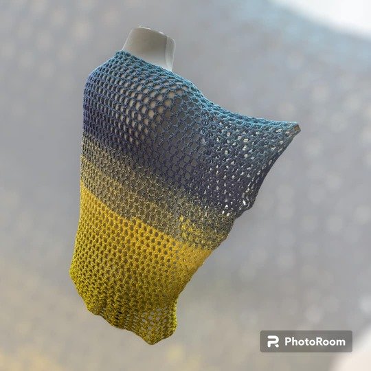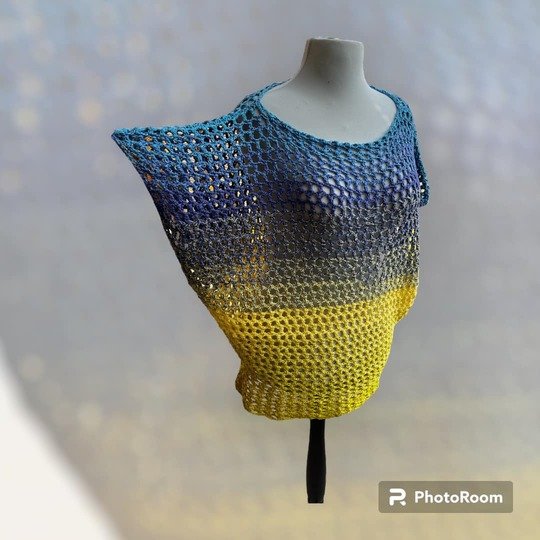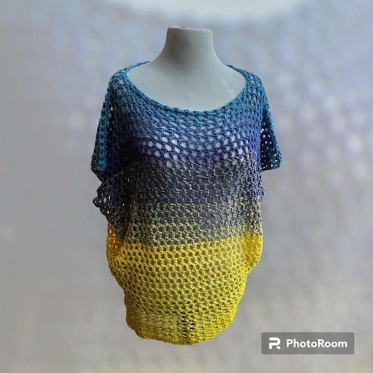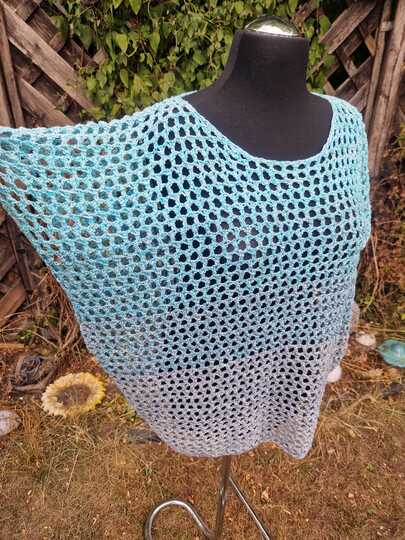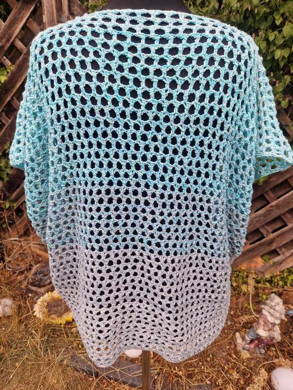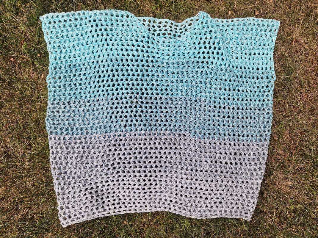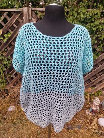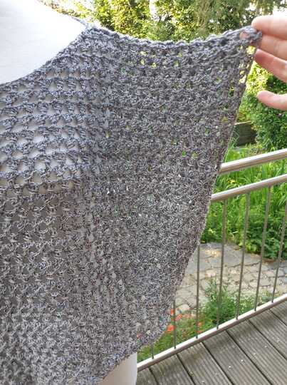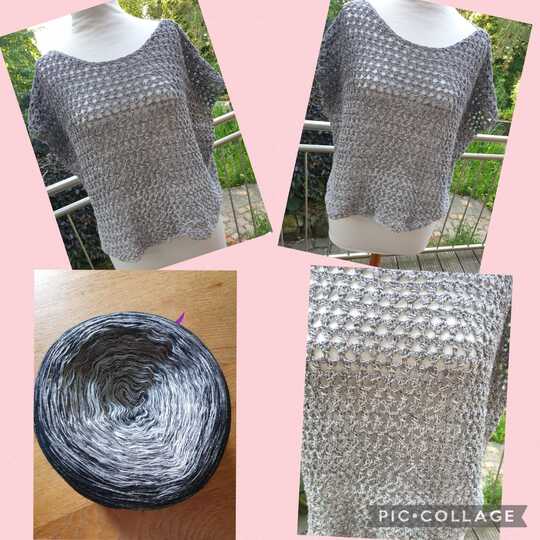 Wenn das Shirt mit einem Farbverlauf-Bobbel gehäkelt wird, muss ab Teilung der Arme der Bobbel von Knötchen zu Knötchen abgewickelt und jeweils halbiert werden, sonst haben Vorder- und Rückteil unterschiedliche Farben.