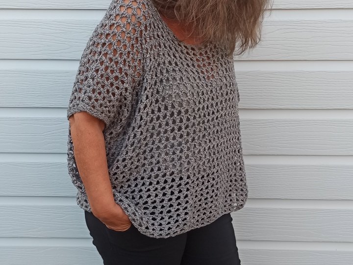 Das Shirt wird von unten nach oben gearbeitet, ohne dass die Seitennähte geschlossen werden müssen. Es kann an jede Konfektionsgröße angepasst werden.