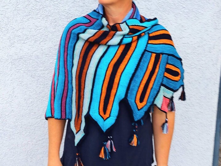 KarlFalke Nr.2 ist ein nur aus rechten Maschen gestricktes Tuch, Schal, Umhang und auf jeden Fall ein Eyecatcher/Blickfang schlechthin. Gestrickt wird in Patchworktechnik, d.h. die einzelnen Patches werden direkt aneinander gestrickt. Die Anleitung ist, wie alle meine Anleitungen, mit vielen Bildern und genauen Schritt-für-Schritt-Beschreibungen der einzelnen Patches versehen.